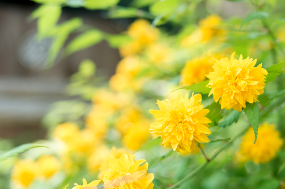 4~5月には、鮮やかな黄色の花を枝の先にたくさん咲かせます。花の直径は2~3cmと小さく、花びらは一重もしくは八重です。この花の姿が美しく、たくさんの和歌にも読まれてきたことから、山吹は春の季語とされます。